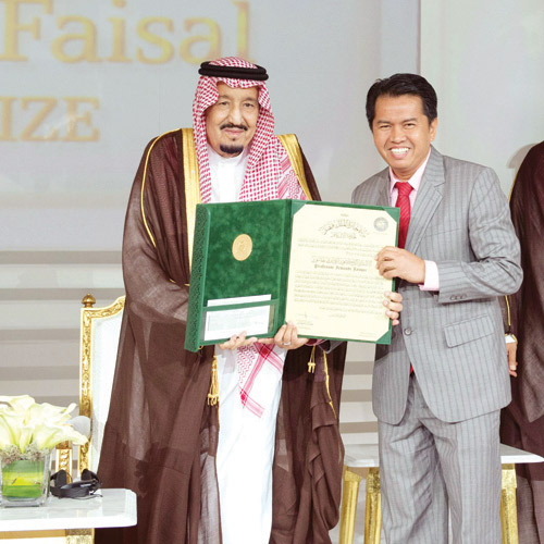 وتفضل خادم الحرمين الشريفين الملك سلمان بن عبدالعزيز آل سعود، بتسليم الفائزين جوائزهم، حيث سلم -أيده الله- جائزة الملك فيصل العالمية فرع خدمة الإسلام للأستاذ الدكتور إرواندي جاسوير، من إندونيسيا، وذلك نظير إسهامه في تأسيس «علم الحلال» في مجال الأغذية من خلال مشاريعه وأبحاثه العلمية وتطويره طرائق علمية حديثة لتحليل مدخلات صناعة «البدائل الغذائية الحلال»، وأخرى عملية لاستخراج الجيلاتين من مصادر غير محرمة مثل الأسماك والإبل، وابتكاره مع مجموعة من الباحثين أساليب اكتشاف سريعة للمكونات غير الحلال في الأغذية، ومستحضرات التجميل، والمنتجات الأخرى، ومنها جهاز «الأنف الإلكتروني المحمول»، إضافة إلى دوره الفاعل في إدارة المعهد العالمي لأبحاث الحلال والتدريب في الجامعة الإسلامية العالمية بماليزيا، وجعله مركزاً بحثياً علمياً في مجال الأغذية من منظور شرعي.