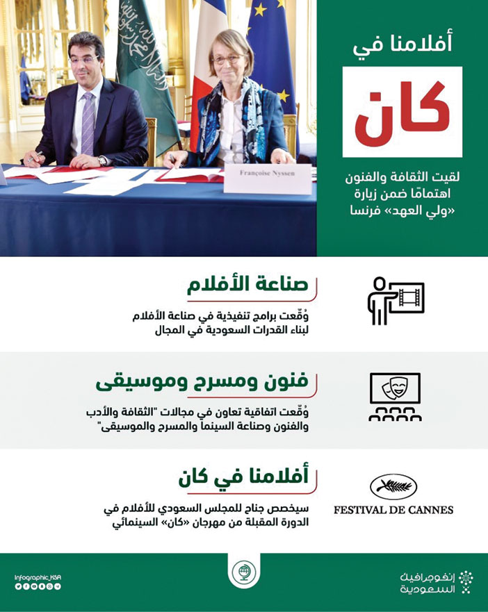 وتأتي هذه الخطوة انسجاماً مع إستراتيجية المملكة الرامية لتطوير قطاع محلي مستدام ومتنوع لصناعة الأفلام. كما شهد معاليه، ومعالي الوزيرة الفرنسية توقيع عدد من البرامج التنفيذية في مجال صناعة الأفلام مع كل من معهد (لا فيميس للأفلام)، و(المعهد الوطني للمحافظة على التراث السمعي والبصري وإدارة الأرشفة الرقمية)، وكذلك مع (أوبرا باريس الوطنية).