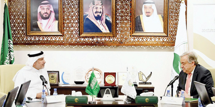 من جانبه رحب الدكتور الربيعة بمعالي الأمين العام للأمم المتحدة، مؤكداً معاليه أهمية التعاون المشترك والمهم بين المركز ومنظمات الأمم المتحدة وقال: المملكة قدمت خلال 20 سنة 65.9 مليار دولار للمنكوبين في العالم وهي تتجاوز دائماً 0.07 % مما قررته الأمم المتحدة من الدول المانحة.