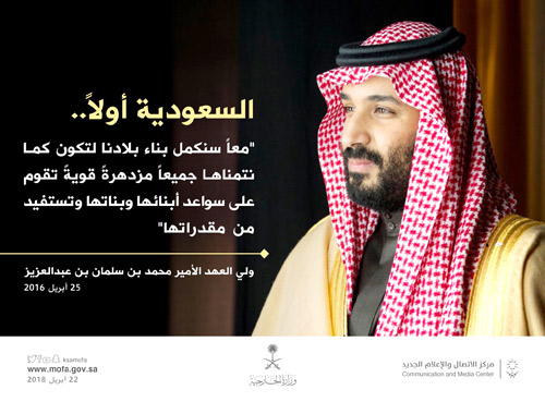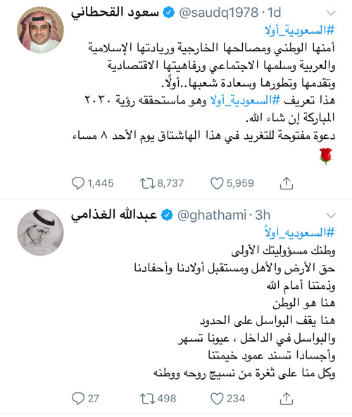 وكان القحطاني قد غرد على حسابه في «تويتر» تحت وسم (السعودية أولاً) وقال: أمنها الوطني ومصالحها الخارجية وريادتها الإسلامية والعربية، وسلمها الاجتماعي، ورفاهيتها الاقتصادية، وتقدمها وتطورها وسعادة شعبها أولاً.. هذا تعريف (السعودية أولاً)، وهو ما ستحققه رؤية 2030 المباركة إن شاء الله.