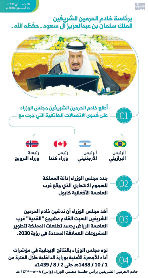 وفي بداية الجلسة، أطلع خادم الحرمين الشريفين المجلس، على فحوى الاتصالات الهاتفية التي جرت بينه وفخامة رئيس جمهورية البرازيل ميشيل تامر، وفخامة رئيس جمهورية الأرجنتين ماوريسيو ماكري، ودولة رئيس وزراء كندا جاستن ترودو، ودولة رئيسة وزراء النرويج إرنا سولبرغ، ونتائج استقباله رئيس اللجنة الفرعية لشراكات حلف شمال الأطلسي متين لطفي بيدر، ورئيس المجلس البابوي للحوار بين أتباع الأديان في دولة الفاتيكان الكاردينال جان لويس توران.