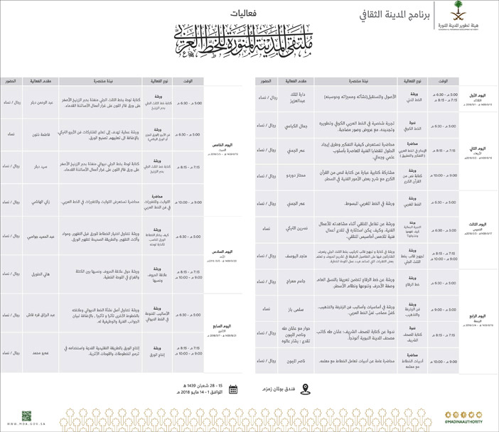 يرعى صاحب السمو الملكي الأمير فيصل بن سلمان أمير منطقة المدينة المنورة رئيس هيئة تطوير المدينة مساء اليوم فعاليات ملتقى المدينة المنورة للخط العربي الذي تنظمه هيئة تطوير المدينة المنورة بفندق زمزم بولمان بالمدينة المنورة على مدار 14 يومًا.