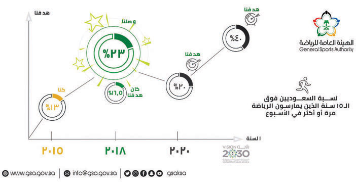 وثمّن معالي رئيس مجلس إدارة الهيئة العامة للرياضة هذا الدعم والاهتمام الكبيرين، مؤكدًا نجاح الهيئة عبر مختلف البرامج والفعاليات الرياضية المتنوّعة، في السعي نحو تحقيق أحد أهداف رؤية 2030، والمتمثّل في زيادة عدد ممارسي الرياضة في المجتمع، حيث أعلن معاليه عن ارتفاع نسبة الممارسين للرياضة من 13 % إلى 23 %، وقال: «أجرت الهيئة العامة للرياضة في عام 2015م أول استبيان وطني للرياضة، وتم تعريف الأشخاص النشطين الذين يمارسون الرياضة بأنهم أشخاص يمارسون نوعًا محددًا من النشاط البدني بشكل منتظم ومتكرر، على الأقل مرة واحدة في الأسبوع؛ لغرض أساسي وهو تحسين الصحة العامة والحفاظ على اللياقة، وقد أظهرت نتائج الاستبيان وضعًا سلبيًّا يجب تحسينه، حيث يمارس الرياضة فقط 13 % من المواطنين السعوديين الذين تزيد أعمارهم على 15 سنة، وكانت تلك النتائج بمثابة نداء استيقاظ للهيئة للمضي قدمًا نحو إطلاق عدة برامج وفعاليات رياضية متنوّعة تسهم في زيادة تلك النسبة والبدء في تنفيذ إستراتيجية الرياضة المجتمعية وبرامجها تجاه المجتمع»، مضيفًا: «خلال الربع الأول من عام 2018م تم إجراء استبيان وطني آخر للرياضة وتنفيذه بذات الآلية، إذ أظهرت النتائج أن المواطنين السعوديين أصبحوا يمارسون الرياضة بشكل أكبر من عام 2015م، حيث ارتفعت نسبة ممارسي الرياضة بصفة دورية من 13 % إلى 23 % ، وبذلك حققت الهيئة العامة للرياضة مستهدفات عام 2020م التي كانت محددة بنسبة 20 %». وأكد معالي رئيس مجلس إدارة الهيئة العامة للرياضة الأستاذ تركي بن عبدالمحسن آل الشيخ، أن هذه النتيجة محفز كبير ودافع قوي لبذل المزيد من العمل والعطاء في مختلف الألعاب الرياضية وكذلك الفعاليات المصاحبة في الملاعب، مضيفًا: «تحقيق هذا الإنجاز جاء نتيجة عمل متكامل في تحقيق الرؤية بين كافة الإدارات داخل الهيئة وبين القطاعات الحكومية المشاركة، وأن هذا التكامل أثّر في المواطنين إيجابيًّا لتحسين جودة الحياة، حيث أدركوا فوائد ممارسة الرياضة لهم ولكافة أفراد المجتمع».