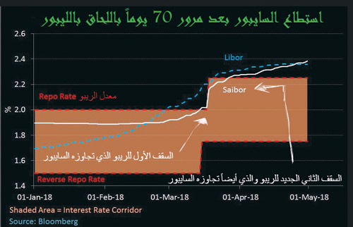 1 - في 20 فبراير الماضي، أصبح السايبور دون معدلات الليبور، مما أوجد الهامش السلبي بين الفائدتين (وصل إلى 19 نقطة أساس) عندها شرعت «ساما» في سلسلة من الإجراءات من أجل تضييق تلك الفجوة بين الفائدتين.