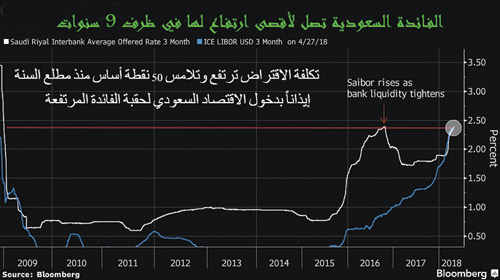 1) الفائدة السعودية تصل لأقصى ارتفاع لها في ظرف 9 سنوات، 2)السايبور يرتفع للمرة الأولى فوق الفائدة الدولارية (ليبور) منذ أكثر من شهرين، 3) السايبر إرتفع بمقدار 49 نقطة أساس منذ بداية هذه السنة إيذاناً بدخول الاقتصاد السعودي لحقبة الفائدة المرتفعة (التي نحن نعيش بداياتها).