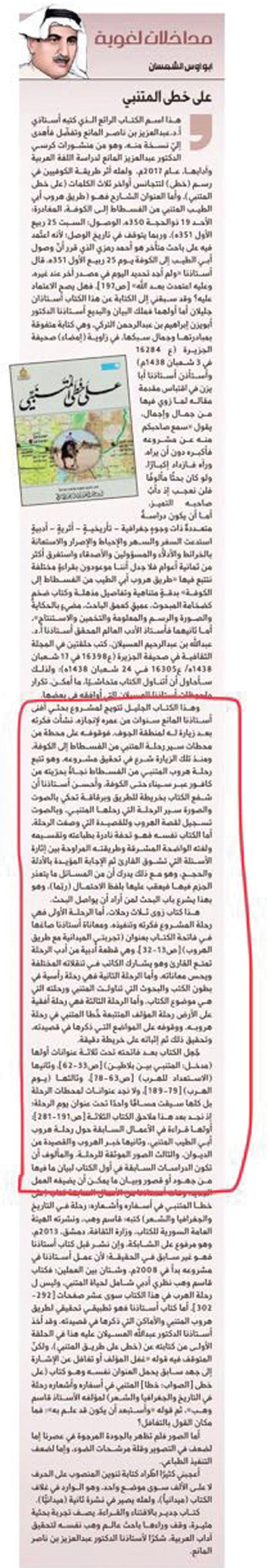 كنت قد قرأت كتاب (على خطى المتنبي) وحضرت محاضرة الدكتور الهدلق في دارة الجاسر يوم السبت 21 /4 /2018 وعزمت بعد أن عدت إلى منزلي – إعجابا بالمتنبي والمانع معا - على أن أكتب قراءة لهذا السفر الجليل ففتحت جهاز الشبكة العنكبوتية استرشادا بمن سبقني إلى الكتابة عنه فإذا أنا بمقالة تحتل صفحة كاملة من صحيفة رسالة الجامعة (جامعة الملك سعود) في عددها ذي الرقم (1286) الصادر يوم 3 /12 /2017 منسوبة لبكري رضوان؛ عنوانها الرئيس (كتاب على خطى المتنبي يرصد ويوثق هروبه الشهير من الفسطاط إلى الكوفة) وتحت هذا العنوان ثلاثة عنوانات أخرى متفرعة منه. استرعى انتباهي الأسلوب المتميز الذي لا بد أن يكون لأستاذ ضليع في اللغة العربية، فمن ذا الذي يكتب (خُطا) بهذا الشكل؟ ومن يجمع لفظ (عنوان) على (عنوانات) إلا من كان له اجتهاداته الخاصة ومذهبه المختار، وهل بقي من هؤلاء في عصرنا إلا ندرة؛ منهم أبو أوس إبراهيم الشمسان؟!