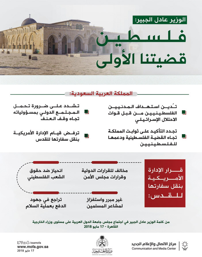 جدد معالي وزير الخارجية الأستاذ عادل بن أحمد الجبير، التأكيد على أن القضية الفلسطينية هي قضية المملكة الأولى، وأن المملكة لن تتوانى عن دعم الفلسطينيين في استعادة حقوقهم المشروعة. وأشار إلى رفض المملكة العربية السعودية قرار الإدارة الامريكية بنقل سفاراتها الى القدس، والتأكيد على أن هذه الخطوة تمثل انحيازاً كبيراً ضد حقوق الشعب الفلسطيني التاريخية والثابتة في القدس. وقال معاليه في كلمته الافتتاحية لأعمال الدورة غير العادية لمجلس جامعة الدول العربية على مستوى أصحاب السمو والمعالي وزراء الخارجية العرب، إننا نجتمع اليوم بسبب التطورات الأخيرة التي تشهدها الأراضي الفلسطينية المحتلة، وما نتج عنها من استهداف للمدنيين الفلسطينيين من قبل قوات الاحتلال وافتتاح الولايات المتحدة الأمريكية سفارتها في القدس، مقدماً خالص العزاء لذوي الشهداء، الذين سقطوا جراء الجرائم الإسرائيلية البشعة، ومتمنياً أن يمُن الله بالشفاء العاجل على الجرحى والمصابين. وأضاف أن القضية الفلسطينية هي قضية المملكة الأولى، كما هي قضية العرب الأولى، ولن تتوانى المملكة عن دعم الفلسطينيين لاستعادة حقوقهم المشروعة، مشيراً إلى أن ذلك هو ما أكده خادم الحرمين الشريفين الملك سلمان بن عبد العزيز آل سعود -حفظه الله- في قمة القدس الأخيرة التي عقدت في الظهران، حيث قال « إن القضية الفلسطينية هي قضيتنا الأولى وستظل كذلك، حتى حصول الشعب الفلسطيني على جميع حقوقه المشروعة، وعلى رأسها إقامة دولته المستقلة وعاصمتها القدس الشرقية». ومضى الجبير إلى القول لم يكتف «حفظه الله» بالتأكيد على ذلك قولا، وإنما أتبعه فعلاً بالإعلان عن تقديم دعم بمبلغ 150 مليون دولار لبرنامج دعم الأوقاف الإسلامية في القدس، إضافة إلى مبلغ 50 مليون دولار لدعم وكالة» الأونروا «، مشدداً على أنه سيستمر بإذن الله في دعم المملكة للفلسطينيين والوفاء بكافة التزاماتها المنصوص عليها في قرارات الجامعة العربية سواء على مستوى القمة أو المستوى الوزاري. وأشار معالى وزير الخارجية إلى أن المملكة العربية السعودية تدين وبشدة استهداف المدنيين الفلسطينيين من قبل قوات الاحتلال الإسرائيلي وتشدد على ضرورة تحمل المجتمع الدولي مسؤولياته تجاه وقف العنف وحماية الشعب الفلسطيني، وتجدد التأكيد على ثوابت المملكة تجاه القضية الفلسطينية، ودعمها للأشقاء الفلسطينيين في استعادة حقوقهم المشروعةوفق قرارات الشرعية الدولية، ومبادرة السلام العربية. وأكد معاليه أن اجتماع اليوم يكتسب أهمية قصوى لكونه يأتي على أثر افتتاح السفارة الأمريكية في القدس، ً وأن هذا الإجراء يعد مخالفة للقرارات الدولية، وقرارات مجلس الأمن، وقرارات الجمعية العامة للأمم المتحدة، وآخرها القرار الصادر في ديسمبر 2017م، وهو القرار الذي أكد نصاً على « أن أي قرارات أو إجراءات تهدف إلى تغيير طابع القدس الشريف أو مركزها أو تركيبتها الديمغرافية ليس لها أي أثر قانوني وأنها لاغية وباطلة «. وأفاد عادل الجبير بأن «المملكة العربية السعودية ترفض قيام الإدارة الأمريكية بنقل سفارتها للقدس وتجدد التأكيد على أن هذه الخطوة تمثل انحيازا كبيراً ضد حقوق الشعب الفلسطيني التاريخية والثابتة في القدس، والتي كفلتها القرارات الدولية ذات الصلة، وحظيت باعتراف المجتمع الدولي، وتمثل تراجعاً كبيراً في جهود الدفع بعملية السلام « مبينا أن حكومة المملكة سبق وأن حذرت من العواقب الخطيرة لهذه الخطوة غير المبررة لما تشكله من استفزاز لمشاعر المسلمين حول العالم. وأشاد معالي وزير الخارجية في ختام كلمته بالمواقف الدولية الواسعة الرافضة للقرار الأمريكي والمؤكدة على حقوق الشعب الفلسطيني المشروعة. وكان وزراء خارجية الدول العربية قد أجمعوا في كلماتهم خلال الجلسة الافتتاحية لأعمال الدورة غير العادية لمجلس جامعة الدول العربية، المنعقدة بالقاهرة أمس على المطالبة بضرورة إجراء تحقيق دولي مستقل في المجازر التي ارتكبتها قوات الاحت