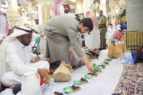 تشهد ساحات وأروقة المسجد النبوي خلال أيام شهر رمضان وعلى مدار عقود من الزمن موائد رمضان، حيث يبدأ الأهالي قبيل الإفطار بتجهيز آلاف سفر الإفطار في المسجد النبوي وساحاته بصورة منتظمة مترامية الأطراف في جميع أرجاء المسجد النبوي، ويحرص أبناء المدينة المنورة على تجهيزها وترتيبها لضيوف الرحمن والمصلين بالمسجد النبوي والسباق على كسب الأجر بإذن الله.