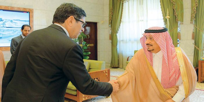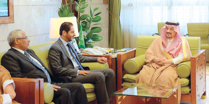 استقبل صاحب السمو الملكي الأمير فيصل بن بندر بن عبدالعزيز أمير منطقة الرياض في مكتبه بقصر الحكم أمس عميد السلك الدبلوماسي سفير جمهورية جيبوتي لدى المملكة ضياء الدين سعيد بامخرمة، ورؤساء المجموعات الدبلوماسية المعتمدين لدى المملكة. وقدم السفراء، لسمو أمير منطقة الرياض التهنئة باسمهم ونيابة عن جميع أعضاء السلك الدبلوماسي المعتمدين لدى المملكة بشهر رمضان المبارك.