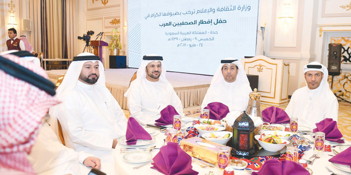 برعاية معالي وزير الثقافة والإعلام رئيس المكتب التنفيذي لمجلس وزراء الإعلام العرب الدكتور عواد بن صالح العواد، نظمت وزارة الثقافة والإعلام مساء أمس الأول في جدة حفل إفطار «الصحفيين العرب»، بحضور رئيس المجلس الأعلى لتنظيم الإعلام بجمهورية مصر العربية الأستاذ مكرم محمد أحمد، ومعالي وزير الإعلام اليمني الأستاذ معمر بن مطهر الإرياني، ومعالي الأمين العام المساعد بجامعة الدول العربية رئيس قطاع الإعلام الدكتورة هيفاء شاكر أبو غزالة، ومدير عام المجلس الوطني للإعلام في دولة الإمارات العربية المتحدة الأستاذ منصور إبراهيم المنصوري، وعدد من رؤساء تحرير الصحف العربية وقادة الفكر والرأي والكتاب في المملكة والدول العربية.