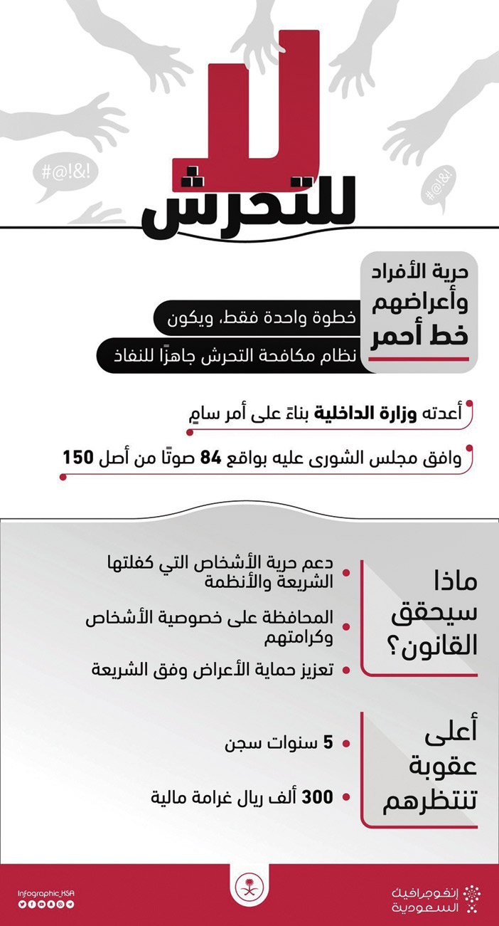 ويتكون مشروع النظام من ثماني مواد بهدف مكافحة جريمة التحرش، والحيلولة دون وقوعها وتطبيق العقوبة على مرتكبيها، وحماية المجني عليه، وذلك صيانة لخصوصية الفرد وكرامته وحريته الشخصية التي كفلتها أحكام الشريعة الإسلامية والأنظمة. ومما تجدر الإشارة إليه أن خادم الحرمين الشريفين وجه وزارة الداخلية بإعداد هذا النظام نظراً لما يشكله التحرش من خطورة وآثار سلبية على الفرد والأسرة والمجتمع، وتنافيه مع قيم ديننا الإسلامي الحنيف، وضرورة سن نظام يجرم ذلك، ويحدد العقوبات اللازمة التي تمنع بشكل قاطع مثل هذه الأفعال.