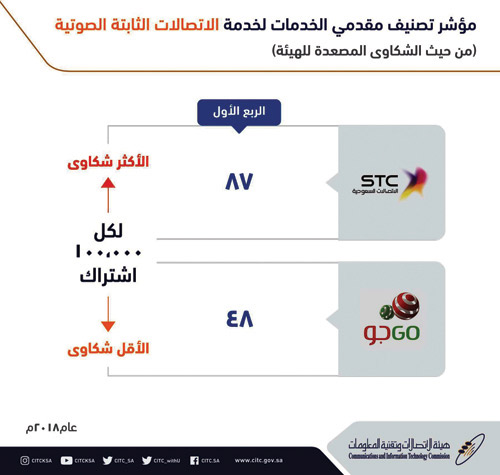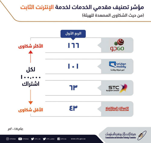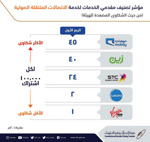 أصدرت هيئة الاتصالات وتقنية المعلومات أمس مؤشر تصنيف مقدمي خدمات الاتصالات من حيث الشكاوى المصعدة للهيئة من المشتركين ضد مقدمي الخدمة للربع الأول من عام 2018م، حيث يعرض المؤشر بيانات الشكاوى التي استقبلتها الهيئة من المشتركين عبر نظامها الإلكتروني. وأشار مؤشر تصنيف مقدمي خدمات الاتصالات من حيث الشكاوى المصعدة للهيئة إلى انخفاض في إجمالي الشكاوى المصعدة للهيئة بنسبة تقدر بـ «9.4%» مقارنةً بالربع الرابع 2017م، مشيراً إلى تصدر شكاوى المشتركين في خدمات الاتصالات المتنقلة الصوتية والإنترنت الثابت. وحسب التصنيف، فقد تصدرت شركة اتحاد اتصالات «موبايلي» قائمة الأكثر شكوى في خدمة الاتصالات المتنقلة الصوتية بزيادة في عدد الشكاوى قدرت بـ «12.5%» عن الربع الرابع 2017، بينما تصدرت شركة الاتصالات المتنقلة السعودية «زين» مقدمة مؤشر خدمة الإنترنت المتنقل الأكثر شكوى بانخفاض في عدد الشكاوى قدر بـ « 23.5%» عن الربع الرابع 2017. وعلى صعيد خدمة الاتصالات الثابتة الصوتية، فقد صنف المؤشر شركة الاتصالات السعودية الأكثر شكوى بانخفاض في عدد الشكاوى قدر بـ « 29.8%» عن الربع الرابع 2017، بينما تصدرت شركة اتحاد عذيب «جو» مقدمة مؤشر خدمة الإنترنت الثابت الأكثر شكوى بانخفاض في عدد الشكاوى قدر بـ «26.9%» عن الربع الرابع 2017. يذكر أن هيئة الاتصالات وتقنية المعلومات قد أصدرت مؤشر تصنيف مقدمي خدمات الاتصالات من حيث الشكاوى المصعدة للهيئة من المشتركين ضد مقدمي الخدمة منذ الربع الأول 2017م بهدف تقديم معلومات للمشتركين عن أداء مقدمي خدمات الاتصالات في حل شكاوى عملائهم؛ ليتمكن المشتركون من اختيار مقدم الخدمة المناسب، وتعزيز الشفافية والتنافسية بين مقدمي خدمات الاتصالات لتطوير الخدمات، والاهتمام بشكاوى عملائهم.