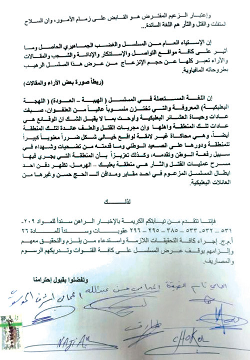 وطالب محامون بـ»إجراء كافة التحقيقات اللازمة واستدعاء بقية طاقم العمل وإلزامهم بوقف عرض المسلسل على كافة القنوات الفضائية»، وطالب المحامون بوقف عرض العمل بسبب ادعاءات بإساءته «لمدينة بعلبك اللبنانية (شرق لبنان) وتصويرها كمرتع للخارجين عن القانون».