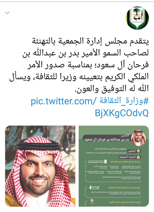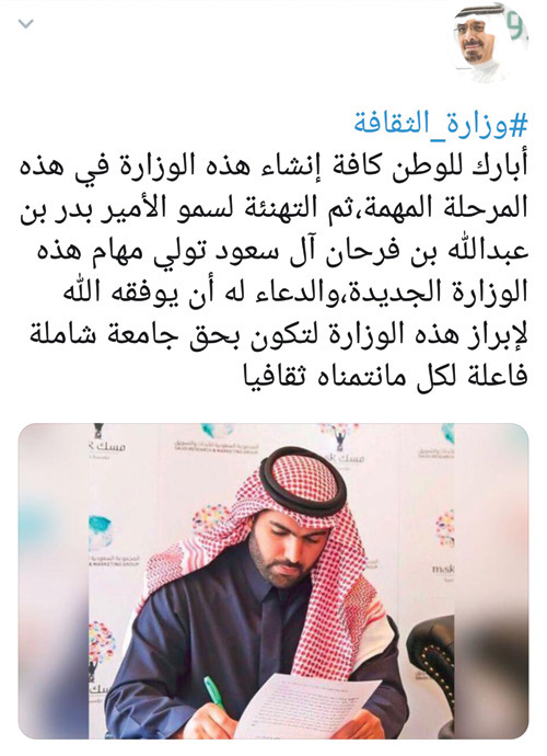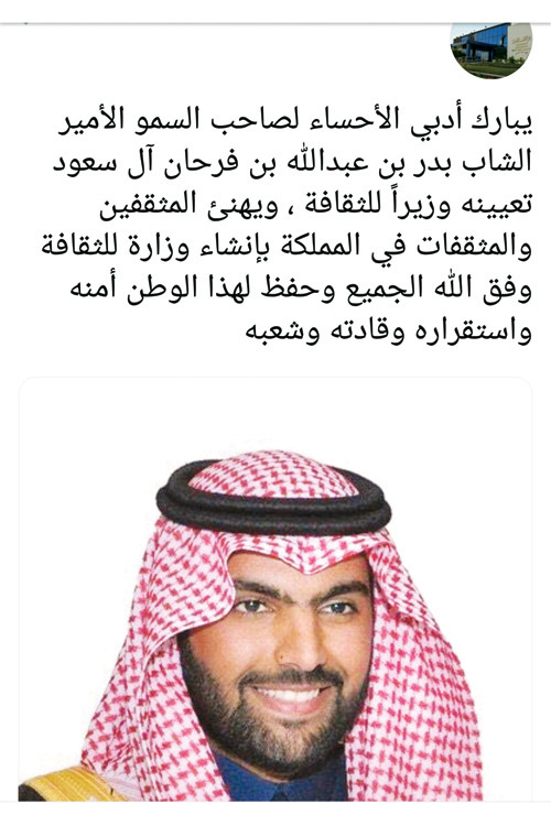 وعن إنشاء وزارة الثقافة، قال رئيس مجلس إدارة المنطقة الشرقية الأدبي، محمد بن عبدالله بودي: كان خبراً مفرحاً ومترجماً لتطلعات الأدباء والمثقفين، عندما صدر الأمر الملكي الكريم بإنشاء وزارة للثقافة، وتعيين سمو الأمير بدر بن عبد الله بن فرحان آل سعود، كأول وزير للثقافة في المملكة، فقد رغب الأدباء والمثقفون بتخصيص وزارة للثقافة، تتولى كامل المسئولية الثقافية، وتقوم برعاية الحراك الثقافي وتطويره، وزارة تمثل طموحات الأديب والمثقف السعودي، وترعى منجزه الإبداعي بل وستكون للثقافة ميزانية مستقلة مما سيسهم في نقلة نوعية وانطلاقة كبيرة للمنجز الثقافي السعودي، والسعي لتنميته ورعايته، فهنيئاً لمعاشر الأدباء والمثقفين بهذه الوزارة، وشكراً جزيلاً لخادم الحرمين الشريفين ولسمو ولي عهده على هذا الحرص والاهتمام الكريم بالثقافة والمثقفين، ونتطلع بإذن الله إلى منجزات كبرى تُجلِّل مشهدنا الثقافي، وتعكس النهضة الشاملة التي يعيشها وطننا الكبير.