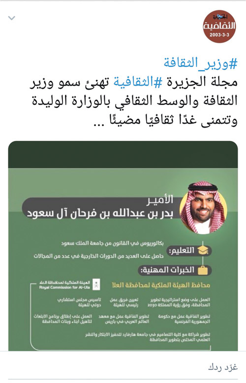 ابتهاج وتفاعل عبر مختلف وسائل الإعلام المحلية، وعبر شبكات التواصل المجتمعي، ما تزال تشهدها المملكة، ترحيبًا بالأوامر الملكية الحكيمة، التي أصدرتها قيادتنا الراشدة، بقيادة خادم الحرمين الشريفين الملك سلمان بن عبد العزيز آل سعود، وولي عهده صاحب السمو الملكي الأمير محمد بن سلمان بن عبد العزيز آل سعود، نائب رئيس مجلس الوزراء وزير الدفاع -أيدهما الله بتوفيقه- التي جاء من ضمنها إنشاء وزارة الثقافة، وتعيين صاحب السمو الأمير بدر بن عبد الله بن فرحان آل سعود وزيرًا للثقافة، إذ أكد المثقفون والمثقفات في المملكة، أن هذا الأمر الكريم سينقل الثقافة إلى مرحلة نوعية تواكب ما تشهده المرحلة الثقافية من تحديات معولمة وتحولات فكرية من جانب، وبما يواكب رؤية المملكة 2030 من جانب آخر، لتصبح الثقافة بمختلف فنونها الأدبية والإبداعية صناعة تجسد البعد الحضاري والثقافي للمملكة عربيًا وعالميًا، حيث وصف جمع من رؤساء الأندية الأدبية الثقافية في المملكة لـ»الجزيرة» ما يعكسه الأمر السامي من اعتناء بالثقافة، واهتمام بالغ بالمثقفين، ودعم للحركة الثقافية في بلادنا، بكل ما من شأنه خدمة الثقافة.. والاحتفاء بالمثقفين والمثقفات.