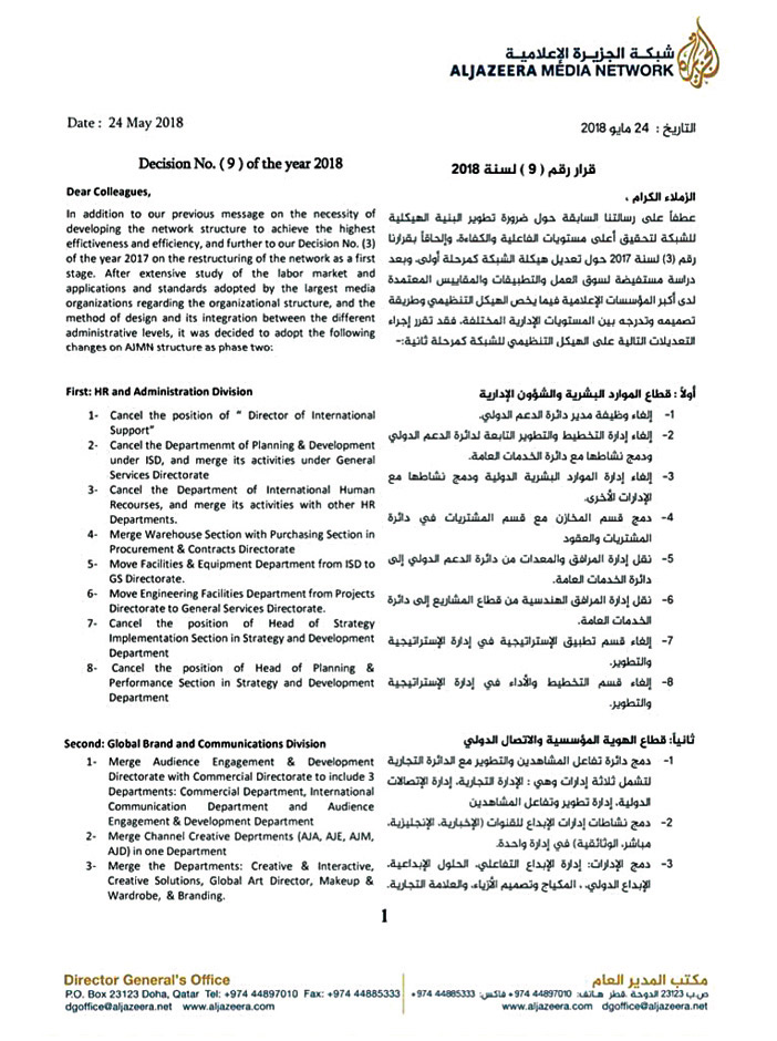 وقالت بلومبرج إنه تم فصل العشرات من الموظفين بالإدارات والمناصب الإدارية، بما في ذلك رؤساء المعايير الفنية والتحريرية، والتدريب، وأدوار أخرى عبر 10 أقسام، وفقًا لوثيقة مؤرخة بتاريخ 24 مايو/أيار الماضي موقعة من المدير العام بالقناة القطرية، مصطفى سواق، لكن لم تقدم الوثيقة رقمًا إجماليًا للوظائف الملغاة.