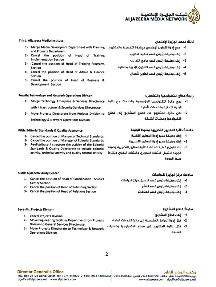وشمل القرار كذلك مركز الجزيرة للحريات وحقوق الإنسان حيث تقرر دمج وظيفة رئيس قسم الإنتاج (اللغة الإنجليزية) مع وظيفة رئيس قسم الإنتاج (اللغة العربية).