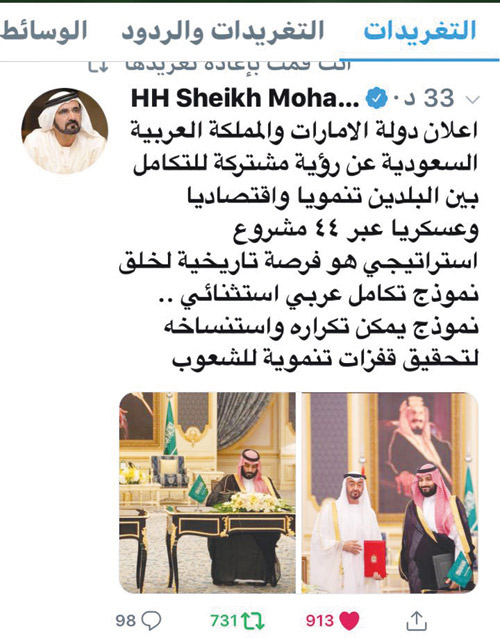 قال الشيخ محمد بن راشد آل مكتوم نائب رئيس دولة الإمارات العربية المتحدة ورئيس مجلس الوزراء بدولة الإمارات العربية المتحدة وحاكم إمارة دبي ووزير الدفاع عبر حسابه في تويتر أمس الجمعة إن إعلان دولة الإمارات والمملكة العربية السعودية عن رؤية مشتركة للتكامل بين البلدين تنموياً واقتصادياً وعسكرياً عبر 44 مشروعاً استراتيجياً هو فرصة تاريخية لخلق نموذج تكامل عربي استثنائي.. نموذج يمكن تكراره واستنساخه لتحقيق قفزات تنموية للشعوب.