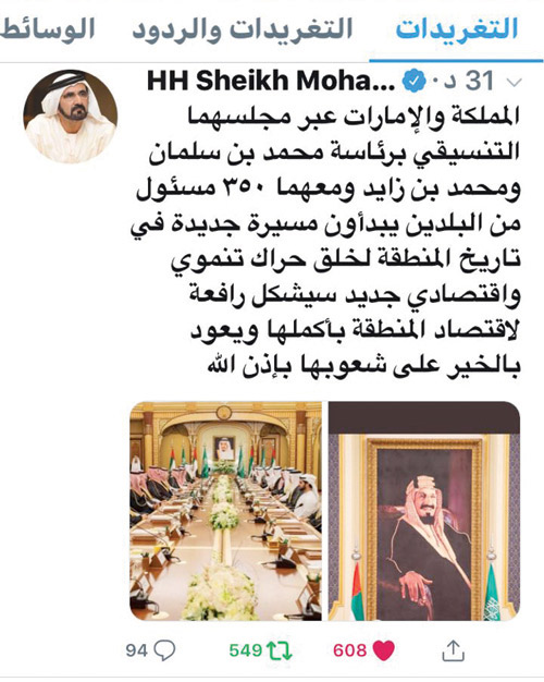 وقال أيضاً عبر تغريدة له إن المملكة والإمارات عبر مجلسهما التنسيقي برئاسة محمد بن سلمان ومحمد بن زايد ومعهما 350 مسؤولاً من البلدين يبدؤون مسيرة جديدة في تاريخ المنطقة لخلق حراك تنموي واقتصادي جديد سيشكل رافعة لاقتصاد المنطقة بأكملها ويعود بالخير على شعوبها بإذن الله.