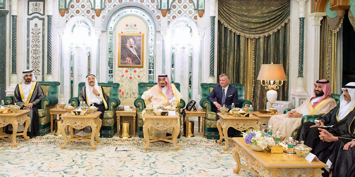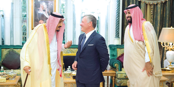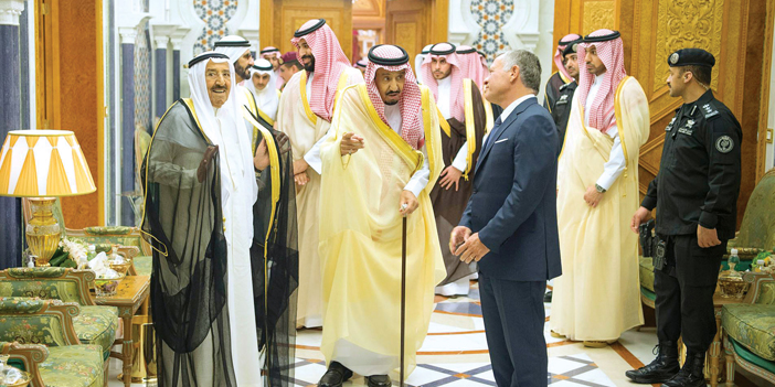 وكان قد استقبل خادم الحرمين الشريفين الملك سلمان بن عبدالعزيز آل سعود - حفظه الله - بحضور صاحب السمو الملكي الأمير محمد بن سلمان بن عبدالعزيز ولي العهد نائب رئيس مجلس الوزراء وزير الدفاع، في قصر الصفا بمكة المكرمة أمس. إخوانه صاحب الجلالة الملك عبدالله الثاني ابن الحسين ملك المملكة الأردنية الهاشمية، وصاحب السمو الشيخ صباح الأحمد الجابر الصباح أمير دولة الكويت، وصاحب السمو الشيخ محمد بن راشد آل مكتوم نائب رئيس دولة الإمارات العربية المتحدة رئيس مجلس الوزراء حاكم دبي، بمناسبة انعقاد الاجتماع الذي يضم الدول الأربع لمناقشة سبل دعم الأردن الشقيق للخروج من الأزمة الاقتصادية التي يمر بها. حضر الاستقبال، صاحب السمو الأمير خالد بن فهد بن خالد، وصاحب السمو الملكي الأمير مقرن بن عبدالعزيز آل سعود، وصاحب السمو الملكي الأمير منصور بن سعود بن عبدالعزيز، وصاحب السمو الملكي الأمير سعود بن عبدالمحسن بن عبدالعزيز المستشار الخاص لخادم الحرمين الشريفين، وصاحب السمو الملكي الأمير طلال بن سعود بن عبدالعزيز، وصاحب السمو الملكي الأمير خالد بن بندر بن عبدالعزيز مستشار خادم الحرمين الشريفين، وصاحب السمو الملكي الأمير الدكتور منصور بن متعب بن عبدالعزيز وزير الدولة عضو مجلس الوزراء مستشار خادم الحرمين الشريفين، وصاحب السمو الملكي الأمير سطام بن سعود بن عبدالعزيز، وصاحب السمو الملكي الأمير الدكتور حسام بن سعود بن عبدالعزيز أمير منطقة الباحة، وصاحب السمو الملكي الأمير الدكتور عبدالعزيز بن سطام بن عبدالعزيز مستشار خادم الحرمين الشريفين، وصاحب السمو الملكي الأمير فيصل بن خالد بن سلطان بن عبدالعزيز أمير منطقة الحدود الشمالية، وصاحب السمو الملكي الأمير سلمان بن سلطان بن عبدالعزيز، وصاحب السمو الملكي الأمير بندر بن مقرن بن عبدالعزيز، وصاحب السمو الملكي الأمير تركي بن محمد بن فهد بن عبدالعزيز المستشار بالديوان الملكي، وصاحب السمو الملكي الأمير محمد بن عبدالعزيز بن محمد بن عبدالعزيز نائب أمير منطقة جازان، وصاحب السمو الملكي الأمير محمد بن عبدالرحمن بن عبدالعزيز نائب أمير منطقة الرياض، وصاحب السمو الملكي الأمير سلطان بن فهد بن سلمان بن عبدالعزيز، وصاحب السمو الملكي الأمير عبدالعزيز بن سعود بن نايف بن عبدالعزيز وزير الداخلية، وصاحب السمو الملكي الأمير أحمد بن فهد بن سلمان بن عبدالعزيز نائب أمير المنطقالشرقية، وصاحب السمو الملكي الأمير عبدالله بن بندر بن عبدالعزيز نائب أمير منطقة مكة المكرمة، وصاحب السمو الملكي الأمير سعود بن سلمان بن عبدالعزيز، وصاحب السمو الملكي الأمير عبدالله بن خالد بن سلطان بن عبدالعزيز المستشار بالديوان الملكي، وصاحب السمو الملكي الأمير سلمان بن سلطان بن سلمان بن عبدالعزيز، وصاحب السمو الملكي الأمير عبدالمجيد بن عبدالإله بن عبدالعزيز، وصاحب السمو الملكي الأمير راكان بن سلمان بن عبدالعزيز، وصاحب السمو الملكي الأمير فيصل بن أحمد بن سلمان بن عبدالعزيز.