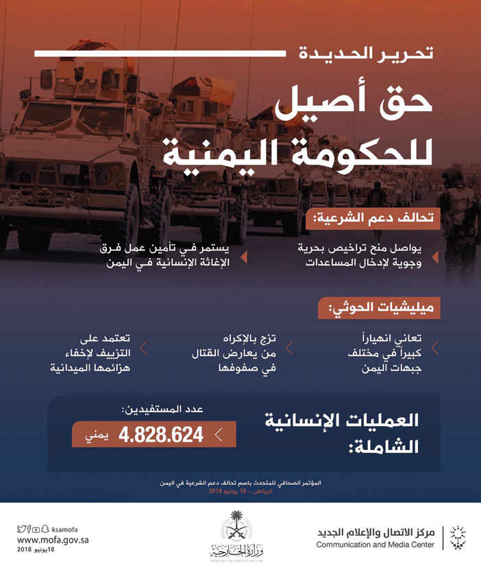 وعن التقدم الذي تحرزه قوات التحالف والجيش اليمني وقوات المقاومة في كلٍ من الحديدة وصعدة، أكد المتحدث الرسمي باسم قوات التحالف أن السيطرة على مطار الحديدة باتت وشيكة جداً، خصوصاً بعد إحكام السيطرة على المنافذ الرئيسية للمدينة، مؤكداً أن ميناء الحديدة يشكل هدفاً استراتيجياً عسكرياً ستكفل الخطة الحربية الموضوعة بعون الله تعالى استعادته وتطهيره من عبث هذه المليشيا الإرهابية المدعومة من إيران، التي تستقبل من خلاله الأسلحة المقدمة لها من إيران، وتعمد بواسطتها إلى إثارة الفوضى والفساد في اليمن، وتواصل عبثها عبر الأعمال الإرهابية التي تمارسها وتستهدف وتهدد بها الملاحة البحرية في مضيق باب المندب. وأشار العقيد المالكي في حديثه لوسائل الإعلام إلى العملية والجهود السياسية في اليمن، التي كان آخرها زيارة السيد مارتن جريفيث إلى اليمن، في بداية شهر يونيو، التقى خلالها بفخامة الرئيس اليمني عبدربه منصور هادي وبعض ممثلي دول المنطقة، قبل أن ينتقل إلى صنعاء، التي اصطدمت جهوده ومختلف المبادرات المقدمة ضمن الإطار العام لإيجاد حل سياسي في اليمن برفض وتعنت الميليشيات الحوثية، وهو ذات الأمر الذي قوبلت به جهود المبعوث السابق للأمم المتحدة السيد إسماعيل ولد الشيخ أحمد، وتعذر إيجاد حل للأزمة اليمنية بسبب رفض الميليشيا الحوثية وعدم الحرص أو الاهتمام بإيجاد حلول على أرض الواقع للخروج من الأزمة اليمنية، عبر تقديم مصلحة الشعب اليمني.
