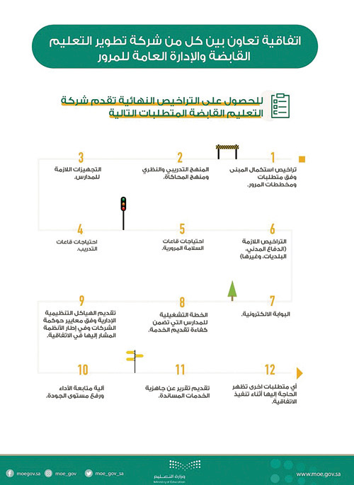 وقع الاتفاقية سعادة اللواء محمد بن عبدالله البسامي مدير الإدارة العامة للمرور بالمملكة، والرئيس التنفيذي لشركة تطوير التعليم القابضة الدكتور سعود بن خضير، على أن تقوم إدارة المرور بتزويدها بكافة الشروط والمواصفات الفنية وتشغيل مدارس تعليم قيادة المركبات في ضوء أعلى معايير السلامة المرورية وتتولى إدارة المرور إصدار رخص القيادة بعد إنهاء كافة متطلبات التدريب والتعليم.