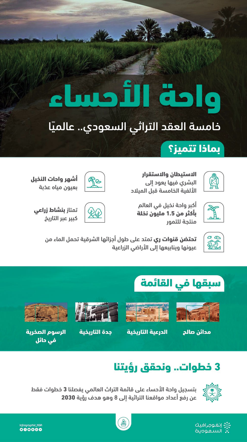 وتعد واحة الأحساء خامس موقع سعودي يضم لقائمة التراث العالمي بإليونسكو بعد موقع مدائن صالح في عام 1429هـ/ 2008م، وحي الطريف بالدرعية التاريخية عام 1431هـ/ 2010م، وجدة التاريخية عام 1435هـ/ 2014م، ومواقع الرسوم الصخرية في موقعي جبة والشويمس بمنطقة حائل في 1436هـ / 2015م.