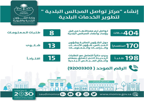 اعتمد معالي وزير الشئون البلدية والقروية المهندس عبداللطيف بن عبدالملك آل الشيخ إنشاء وتشغيل (مركز تواصل المجالس البلدية) لتحقيق التواصل المباشر بين مكتب معاليه ورؤساء وأعضاء المجالس البلدية من خلال تخصيص الرقم الموحد (920033033), الذي يمكن من خلاله تواصل أعضاء المجالس البلدية البالغ عددهم (3156) عضواً, الذين يمثلون (285) مجلسا بلديا مع الوزارة لاستقبال المقترحات والاستفسارات والملاحظات والشكاوى والآراء كافة المتعلقة بالعمل البلدي واختصاصات وصلاحيات المجالس البلدية.