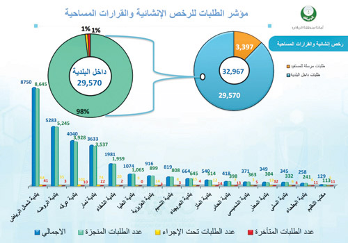 وتعاملت بلديّات العاصمة مع 32,967 طلبًا إلكترونيّا على الرخص الإنشائية، أعيد منها للمستفيدين 3,397 طلبًا لاستكمال الاشتراطات، فيما باشرت 29,570 طلبًا، وتمكن من إنجاز 98 بالمائة منها، ولا تزال 1 بالمائة من الطلبات تحت الإجراء، وبلغت النسبة ذاتها في المتأخرة. وأوضحت الأمانة أن مؤشرات قياس الأداء للبلديّات هي إحدى المبادرات التي تهدف إلى تطوير عمل القطاع البلدي، وتحسين مستوى الخدمات المقدمة للمستفيدين ونيل رضاهم، مؤكدة أن نسب الإنجاز والتأخير في المؤشرات تنطلق من معيار مدة التنفيذ، حيث حددت مدة تنفيذ خدمات الرخص المهنية بـ5 أيام عمل كحد أعلى، و10 أيام عمل بالنسبة لتنفيذ خدمات الرخص الإنشائية.