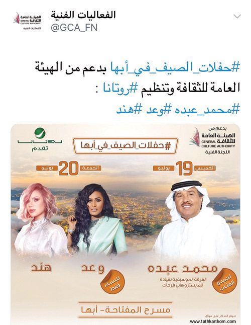 وفي ليلة الجمعة العشرين من يوليو تغني كل من الفنانة السعودية وعد والبحرينية هند على ذات المسرح الذي يتسع لأكثر من 3500 متفرج، في حفل تحضره السيدات فقط.