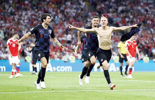 حقق منتخب كرواتيا إنجازا رائعا بالوصول للدور نصف النهائي للمرة الثانية في تاريخه عندما تغلب على المنتخب المستضيف روسيا بركلات الترجيح، وظهرت المواجهة بندية كبيرة وأحداث مثيرة حيث تعادل المنتخبان 2-2 في الوقتين الأصلي والإضافي، لتمتد المباراة الى ركلات الترجيح. وانتهى الوقت الأصلي بالتعادل بهدف لهدف وسجل لروسيالدينيس تشيريشيف (31)، في حين سجل لكروايتا لاندري كراماريتش (39). وخاض المنتخبان شوطين إضافيين، فتقدمت كرواتيا عبر المدافع دوماغوي فيدا (101)، وردت روسيا عبر المدافع ماريو فرنانديش (115). لتذهب المباراة لركلات الترجيح التي ابتسمت لكرواتيا عندما سجلت أربع ركلات وأضاعت واحدة في حين سجل منتخب روسيا ثلاث ركلات وأضاعوا اثنتين. وستواجه كرواتيا منتخب انجلترا في الدور نصف النهائي.