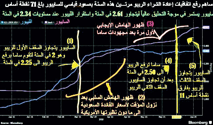 أكَّد محلل السندات في «الجزيرة» أن الفائدة السعودية التي تُعد العمود الفقري لمعظم قروض الشركات والأفراد استمرت في موجة الصعود القياسية، وذلك بعد قيام مؤسسة النقد «ساما» برفع اتفاقية إعادة الشراء مرتين هذه السنة. وقال محمد الخنيفر إن هذه الخطوة قادت السايبور ليرتفع 71 نقطة أساس، وذلك وفقاً لبيانات الخميس الماضي. أي أن المعدل المتوسط لزيادة نسبة السايبور بلغ 11.8 نقطة أساس شهريًا خلال فترة الستة الأشهر الماضية. هذا الأمر دفع اقتصاديي بلومبرج بأن يتوقعوا أن تنهي الفائدة السعودية هذه السنة بارتفاع يصل إلى 3% و3.75 بنهاية 2019.