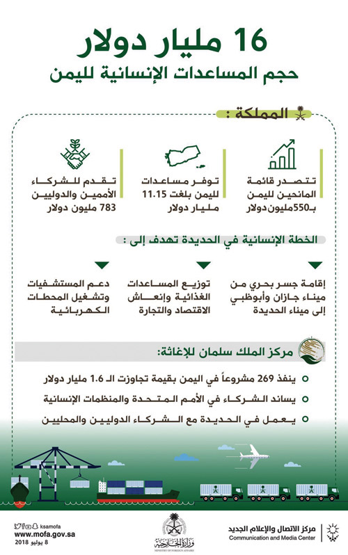 وقال الدكتور الجطيلي بلغ إجمالي مساعدات المملكة المقدمة لليمن من مايو 2015م حتى الآن 11.15 مليار دولار على النحو التالي 1.621.523.544 دولاراً إجمالي المساعدات الإنسانية والإغاثية المقدمة من خلال المركز وإجمالي المساعدات المقدمة إلى الزائرين بلغ 1.130.186.557 دولارا و2.950.000.000 دولار إجمالي والمساعدات الإنمائية المقدمة لليمن و2.275.718.347 دولارا كمساعدات حكومية ثنائية و3 مليارات دولار إجمالي المبلغ المقدم إلى البنك المركزي و500 مليون دولار لخطة الاستجابة الإنسانية الشاملة 2018م.