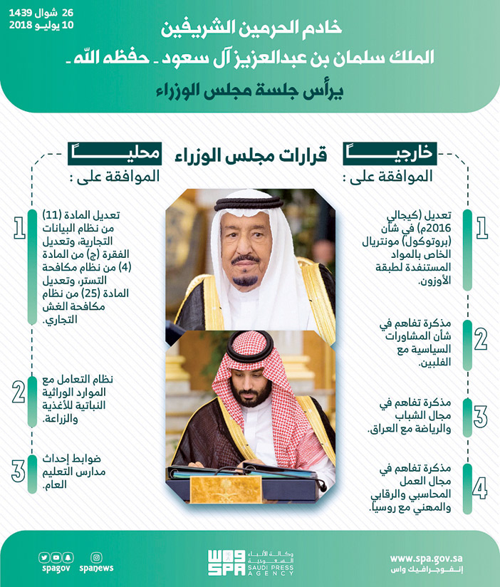 أولاً : بعد الاطلاع على ما رفعه معالي وزير البيئة والمياه والزراعة رئيس مجلس إدارة الهيئة العامة للأرصاد وحماية البيئة، وبعد النظر في قرار مجلس الشورى رقم (130/ 32) وتاريخ 1/ 8/ 1439هـ، قرر مجلس الوزراء الموافقة على تعديل (كيجالي 2016م) في شأن (بروتوكول) مونتريال الخاص بالمواد المستنفدة لطبقة الأوزون. وقد أُعد مرسوم ملكي بذلك.