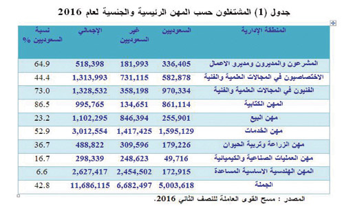 بالأرقام المطلقة لا يوجد سوى 135 ألف وافد أجنبي يعملون في المهن الكتابية.. ولكن بالنسب فإن نسبة السعوديين فيها وصلت في 2016 إلى حوالي 87 في المائة، وهي نسبة مرتفعة ومن المقبول الوصول إليها عبر الفترة الماضية، خاصة أن هذه المهن لا تحتاج لمؤهلات تعليمية عالية، ولكنها تقع في مستويات التعليم المتدنية.