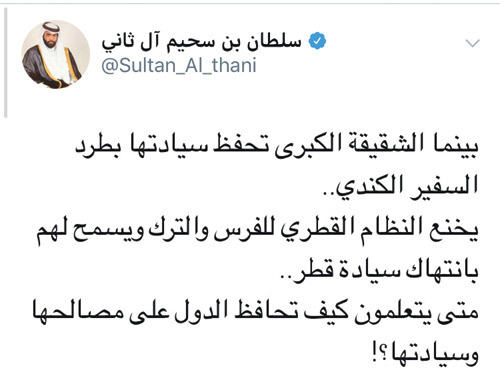 من جهته، قال الشيخ سلطان بن سحيم آل ثاني في تغريدات له على تويتر ظهر أمس: «بينما الشقيقة الكبرى تحفظ سيادتها بطرد السفير الكندي يخنع النظام القطري للفرس والترك، ويسمح لهم بانتهاك سيادة قطر.