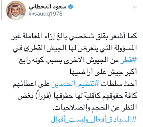 عبَّر المستشار في الديوان المشرف على مركز الدراسات والشؤون الإعلامية سعود القحطاني عن قلقه إزاء اعتقالات نشطاء المجتمع المدني وتهجير القبائل في قطر، حاثًّا سلطات تنظيم الحمدين على الإفراج عنهم فورًا، وعودة القبائل لديارها، مبديًا قلقه الشخصي من المعاملة غير المسؤولة التي يتعرض لها الجيش القطري من بعض الجيوش الذي يعتبر رابع أكبر جيش على أراضيها.