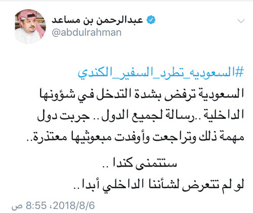 جاء ذلك بتغريدات القحطاني في وقت مبكر من صباح أمس الاثنين على حسابه في تويتر، وتحديدًا بعد قرار السعودية طرد السفير الكندي؛ ليعطي بتغريداته معنى حقيقيًّا للسيادة، وكيف تكون أفعالاً لا أقوالاً.. وقال القحطاني في تغريداته: أشعر بقلق شخصي بالغ إزاء اعتقالات نشطاء المجتمع المدني وتهجير القبائل في قطر على يد القوات الإيرانية ومَن جاورها.