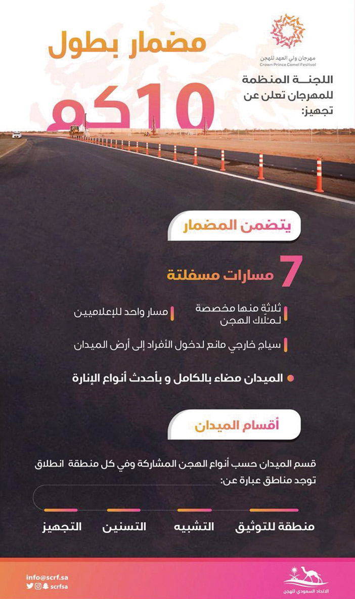 وجهزت اللجنة المنظمة لمهرجان ولي العهد للهجن، مضمارًا لمنافسات سباقات الهجن بطول 10 كيلو مترات، ويتضمن 7 مسارات مسفلتة، ثلاثة منها مخصصة لمُلّاك الهجن، ومسار واحد للإعلاميين، محاطة بسياج خارجي يمنع لدخول الأفراد إلى أرض الميدان.
