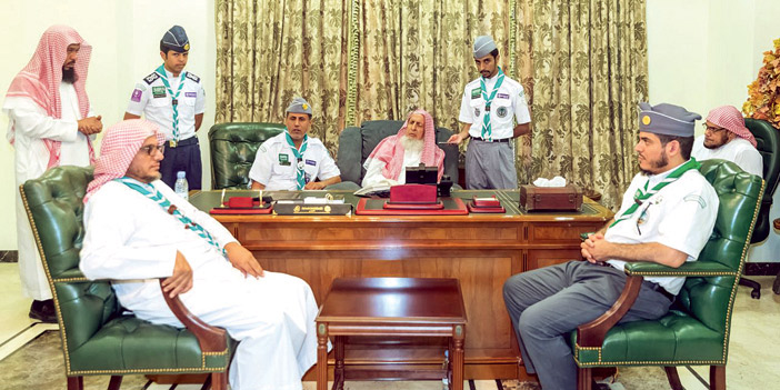 استقبل سماحة مفتي عام المملكة ورئيس هيئة كبار العلماء والرئيس العام للبحوث العلمية والإفتاء الشيخ عبدالعزيز بن عبدالله آل الشيخ، بمقر الرئاسة بمكة المكرمة، أمس نائب رئيس جمعية الكشافة العربية السعودية والمشرف العام على معسكرات الخدمة العامة الدكتور عبدالله بن سليمان الفهد، وقائد عام المعسكرات الدكتور صالح بن رجاء الحربي، وعدداً من القيادات الكشفية والكشافين. وقدم نائب رئيس الجمعية لسماحته في بداية اللقاء فكرة عن ما تقوم به الكشافة من جهود في خدمة حجاج بيت الله الحرام، ومنها طباعة الخرائط الإرشادية، وإرشاد التائهين وتفويج الحجاج. وأشاد سماحته بما يقدمه الكشافة من عمل جيد ومفيد ومساهمة في مساعدة الحجاج ومن أهمها إيصاله للحاج التائه إلى مقره في حال أن تاه عن أسرته أو حملته.