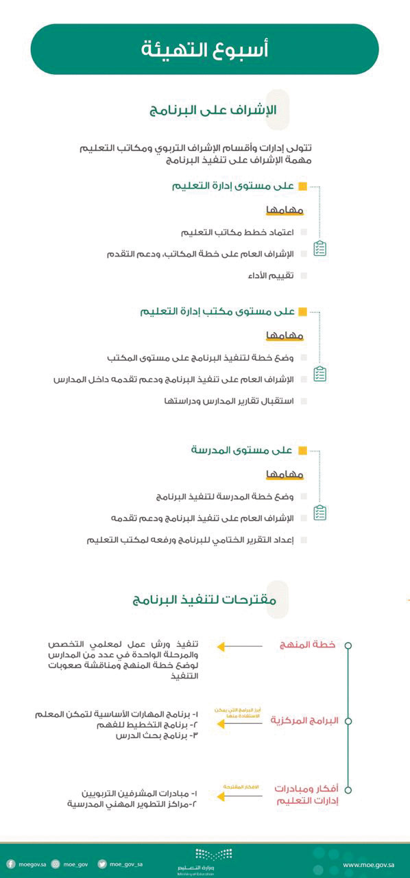 وجَّه معالي نائب وزير التعليم الدكتور عبدالرحمن بن محمد العاصمي بتنفيذ برنامج التطوير المهني للمعلمين والمعلمات خلال أسبوع التهيئة المهنية (أسبوع عودة المعلمين) في جميع الإدارات التعليمية، وتزويد المعلمين والمعلمات بكل ما يعزز النمو المهني لديهم لتعزيز الاستعداد للعام الدراسي الجديد، ورفع التقارير الختامية للمركز الوطني للتطوير المهني التعليمي.