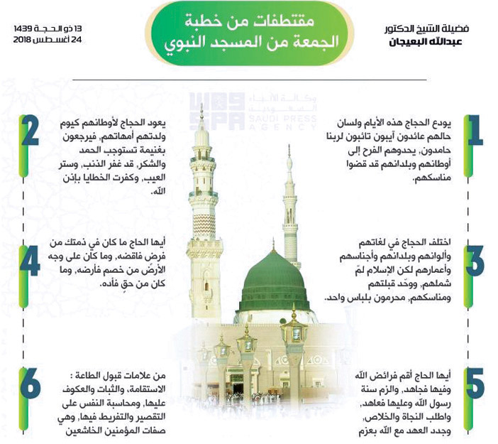 وفي المدينة المنورة هنأ فضيلة إمام وخطيب المسجد النبوي الشيخ عبدالله البعيجان حجاج بيت الله الحرام على ما منّ الله به عليهم من أداء مناسك الحج بيسر وطمأنينة, داعياً المولى جل وعلا أن يتقبلّ حجهم ويغفر ذنبهم, ويعودوا إلى ديارهم فرحين مستبشرين.