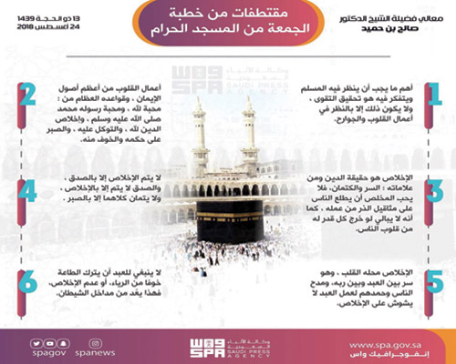 ودعا فضيلته الله عز وجل أن يحفظ لهذه البلاد أمنها وقيادتها على ما قدموه ويقدمونه من خدمات جليلة لحجاج بيت الله الحرام ومن توسعات وتسهيلات يشهد لها القاصي والداني حيث تقوم الجهات الحكومية والمعنية كافة بتكثيف جهودها في كل عام لخدمة الحجاج والمعتمرين والزوار لبيت الله الحرام بتوجيهات وعناية وحرص من خادم الحرمين الشريفين الملك سلمان بن عبد العزيز آل سعود وسمو ولي عهده الأمين ـ حفظهما الله ـ.