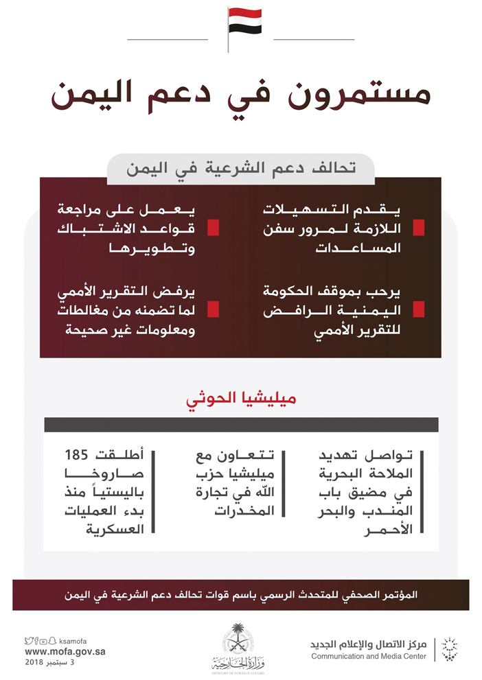 وتطرق المالكي إلى العمليات الإنسانية وقال: نحن نرفض تقارير الخبراء المعنيين باليمن لاحتوائها على كثير من المغالطات والتي لن يقبل بالشفافية الصادقة وليس محاباة طرف على الآخر، والحروب بطبيعة الحال يحصل فيها أخطاء ولكن التحالف حريص كل الحرص بعدم المساس بالمدنيين.