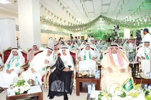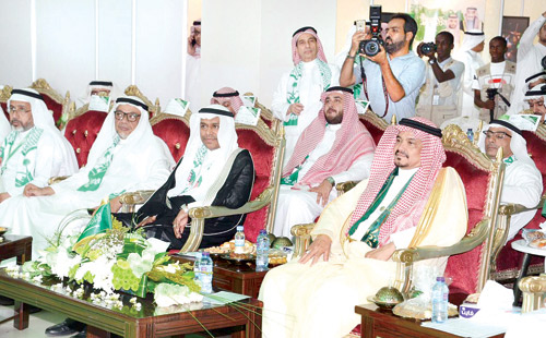 واستهل معاليه الحفل الخطابي المعد بهذه المناسبة، والذي بدئ بآيات من الذكر الحكيم، بكلمة رفع خلالها أسمى آيات التهاني والتبريكات لخادم الحرمين الشريفين الملك سلمان بن عبدالعزيز آل سعود وسمو ولي عهده الأمين - حفظهما الله- وللشعب السعودي الكريم بمناسبة اليوم الوطني.