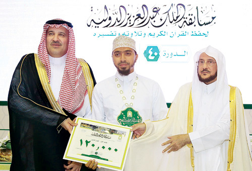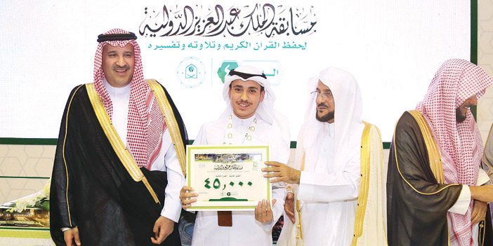 وأوصى الوزير المشاركين في المسابقة بتقوى الله بالسر والعلن والعمل بالقرآن الذي هو سائقنا ودليلنا في الدنيا, والنأي بكتاب الله عن مزايدات أهل الغلو والتطرف الذين أرهبوا الناس وقتلوهم باسم القرآن زورًا وعبثاً بكتاب الله. وأكد الأمين العام لمسابقة القرآن الكريم المحلية والدولية الدكتور منصور بن محمد السميح أن هذه المسابقة الدولية المباركة التي تقام لأول مرة عبر تاريخها المجيد في مسجد الرسول -صلى الله عليه وسلم- هي تكريم لأهل القرآن وتشجيع لحفظ كتاب الله الكريم.. مشيراً إلى أنَّ القرآن الكريم هو منهج المملكة في كل تعاملاتها، وأنها تفخر بخدمة الحرمين الشريفين، والاهتمام بكتاب الله وتكريم أهله، وتشجيع حفظته، معبراً عن شكره لراعي المسابقة خادم الحرمين الشريفين وسمو ولي عهده الأمين -حفظهما الله-، ولسمو أمير المنطقة لتفضله بحضور الحفل وتكريم الفائزين، كما أزجى شكره وتقديره لوزير الشئون الإسلامية والدعوة والإرشاد على دعمه ومتابعته المستمرة لأعمال اللجان العاملة بالمسابقة. وفي ختام الحفل كرم سمو أمير المنطقة 13 فائزاً في أفرع المسابقة الأربعة.