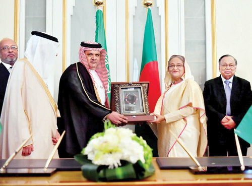ونوهت حسينة بالنجاحات الاقتصادية التي حققتها بلادها، حيث إن بنجلاديش الآن وفقاً لما أعلنته الأمم المتحدة في مارس 2018 مؤهلة للخروج من تصنيف مجموعة أقل البلدان نمواً إلى بلد نامٍ، كما يجرى العمل على رؤية 2021 لتكون دولة نامية، ورؤية 2041 لنصبح دولة متقدمة، فيما يعد اقتصادها من بين أكبر 32 اقتصاد في العالم من حيث القوة الشرائية ومن بين الاقتصادات العشرة الأسرع نمواً، مشيرة إلى أن الموقع الاستراتيجي لبنجلاديش يجعلها مركزا نشطاً للربط الإقليمي والاستثمارات الأجنبية، كما أن هناك 8 مناطق لتجهيز الصادرات الصناعية، كما يجري العمل على تطوير 100 منطقة اقتصادية للصناعات الجديدة والاستثمار. وأبدت ترحيبها بالاستثمارات السعودية في قطاعات : سوق المال، الطاقة، الاتصالات وتكنولوجيا المعلومات، البتروكيماويات، الصناعات الدوائية، بناء السفن، التصنيع الزراعي، البحث والتطوير والابتكار التكنولوجي، المياه، البنية التحتية، الصناعة التحويلية، الخدمات المصرفية والمالية اللوجستية، منوهة بالمزايا الكبيرة التي تقدمها بنجلاديش للمستثمرين الأجانب من ناحية معدل الربحية والحوافز الضريبية وحرية تحويل الأموال والأرباح وحماية الاستثمارات والتسهيلات في استيراد المواد والآلات وانخفاض أسعار الخدمات وتوافر العمالة المدربة.