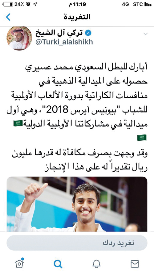 من جانبه هنأ معالي المستشار تركي بن عبد المحسن آل الشيخ رئيس الهيئة العامة للرياضة بارك للنجم العسيري تحقيقه الميدالية الذهبية، ووجه بتقديم مكافأة مالية للاعب قدرها مليون ريال.. وقال معاليه في تغريدة على حسابه الخاصة على منصة التواصل الاجتماعي تويتر: «أبارك للبطل السعودي محمد عسيري حصوله على الميدالية الذهبية بدورة الألعاب الأولمبية للشباب في بيونيس ايرس 2018 وهي أول ميدالية في مشاركاتنا الأولمبية الدولية. وقد وجهت بصرف مكافأة له قدرها مليون ريال تقديرا له على هذا الإنجاز.
