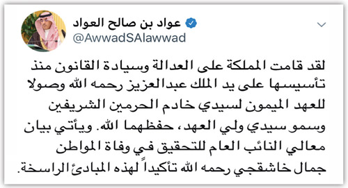 إلى ذلك قال وزير العدل رئيس المجلس الأعلى للقضاء وليد الصمعاني «إن إقامة العدل هو نهج المملكة العربية السعودية الدائم الذي لن تحيد عنه، وهو من أهم مرتكزاتها عبر تاريخها المجيد منذ تأسيسها وحتى يومنا الحاضر بقيادة خادم الحرمين الشريفين الملك العادل سلمان بن عبدالعزيز آل سعود، وولي عهده الأمين صاحب السمو الملكي الأمير محمد بن سلمان بن عبدالعزيز -حفظهما الله-.