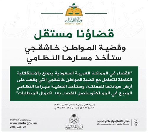 وشدد على أن القضاء في المملكة يتمتع بالاستقلالية الكاملة للتعامل مع القضية التي وقعت على أرض سيادتها للمملكة، منوهاً بأن القضية ستأخذ مجراها النظامي المتبع في المملكة وستصل للقضاء بعد اكتمال المتطلبات.